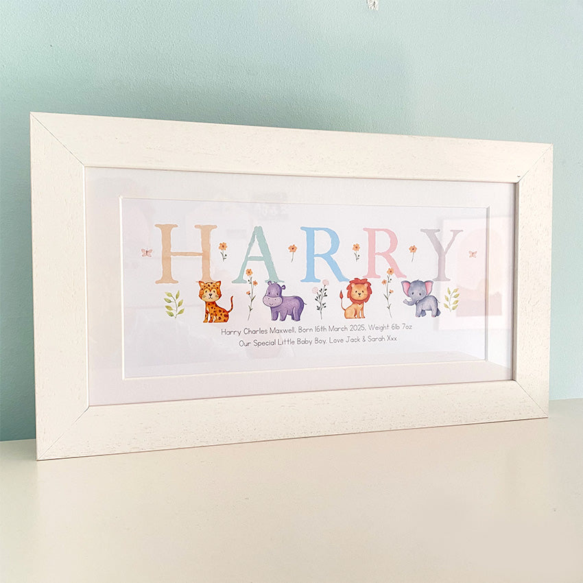 Our Animal Pastels Name Frame is a beautiful personalised gift featuring soft pastel lettering and a charming mix of friendly animal illustrations. Each letter of your chosen name is displayed in a different pastel shade — up to 10 letters — for a bright but gentle look children (and parents) love.