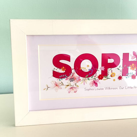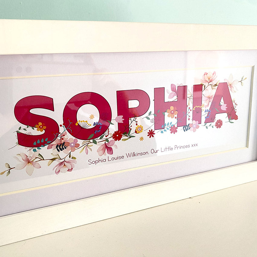 A personalised name print with floral-themed lettering and optional custom text, available framed or as a print only.