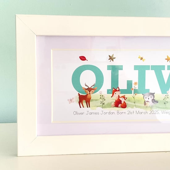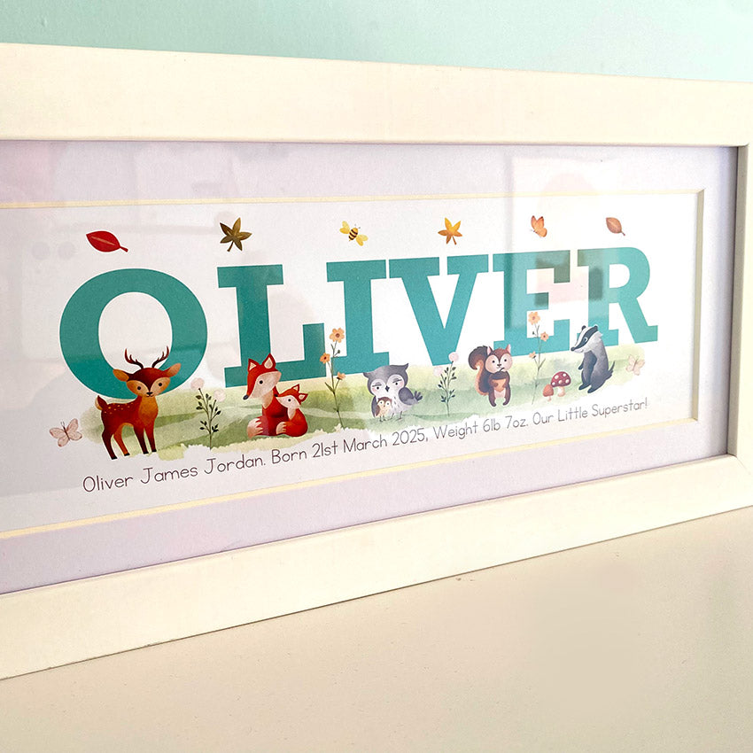A framed, personalised name print featuring woodland animal illustrations and your choice of name colour.