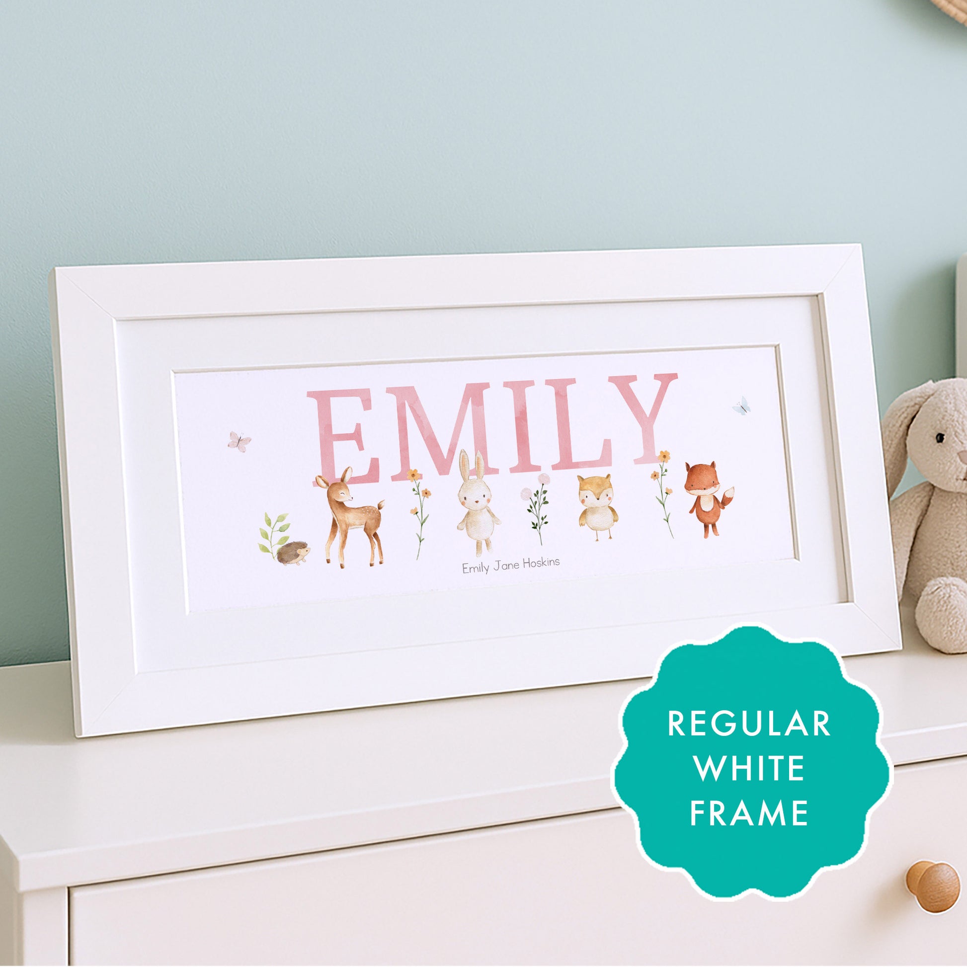 Our best-selling Woodland Animal Pastel Name Frame features adorable woodland illustrations and soft pastel letteringâavailable in pink or blue.