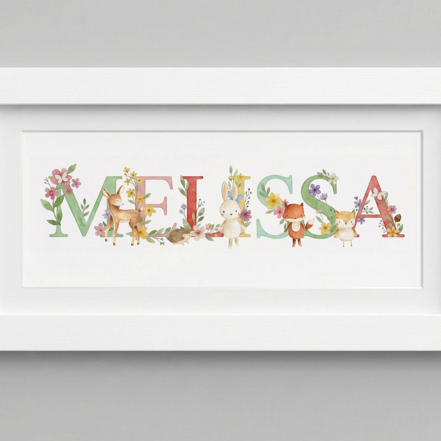 A soft watercolour illustrated keepsake, personalised with your child’s name and supplied ready framed. Designed to feel calmer and more timeless than bright nursery prints, making it a beautiful gift for new babies, christenings and special occasions.