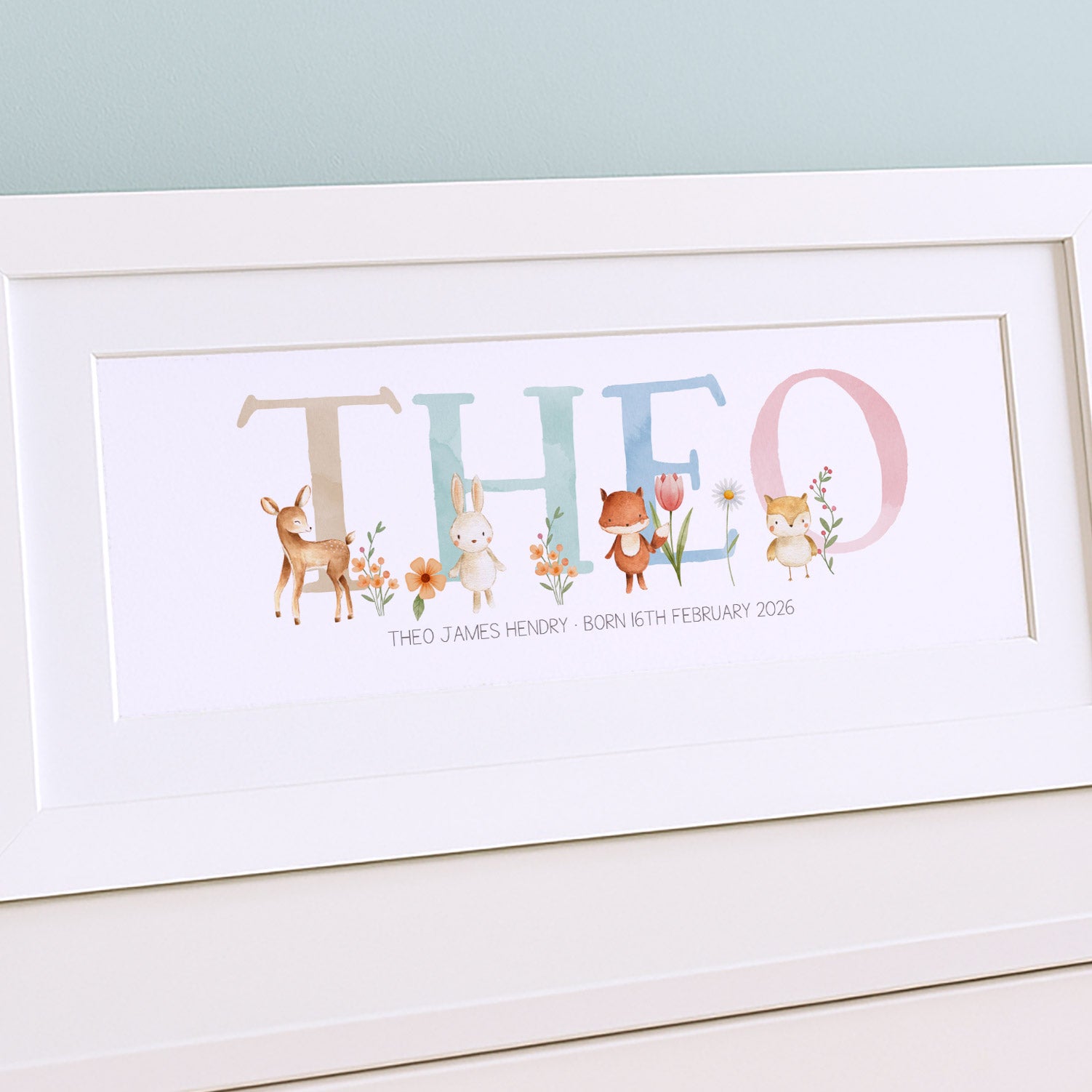 🦊 Supplied Framed – Woodland Pastel Multi-Coloured Name Frame ✨